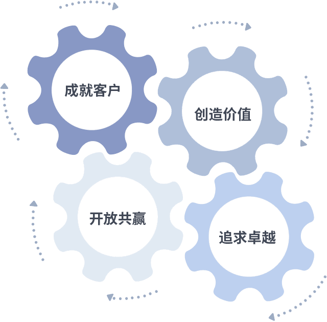 成就客户是一切决策的出发点,,,创造价值是衡量所有工作的标准,,,,追求卓越是我们做事做人的态度,,开放共赢是我们的格局也是最终的结果。。价值观的齿轮环环相扣,,,,推动着组织里的每个人不断向前。。。