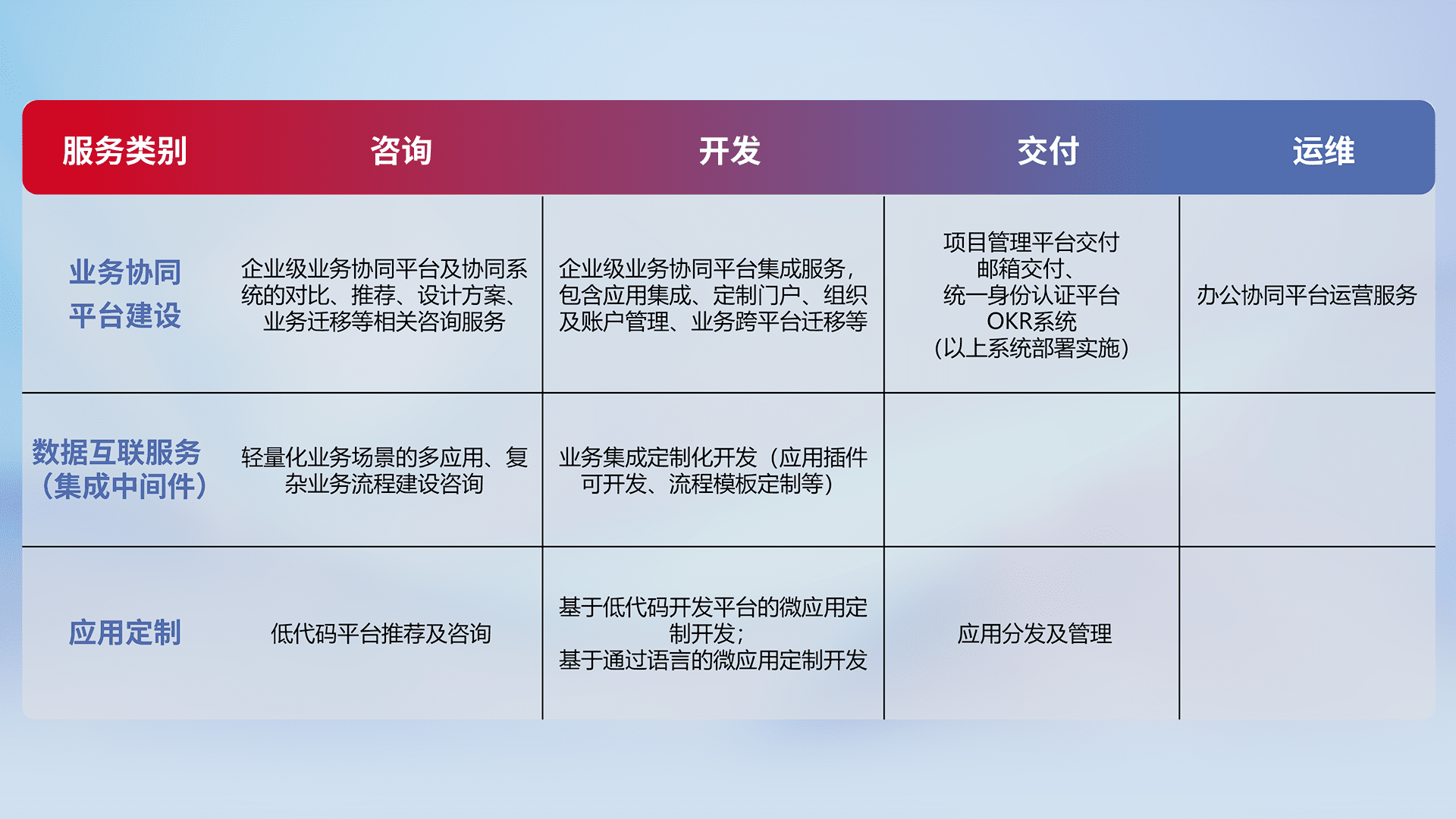 针对钉钉、、、企微、、IDaas等平台级产品提供产品的规划、、、、方案、、交付、、、、定制化开发等服务,,,,实现如统一协同办公、、智能客户服务、、、混合会议管理、、智能数据查询、、、、等业务场景,,,,实现数字化转型。。。。