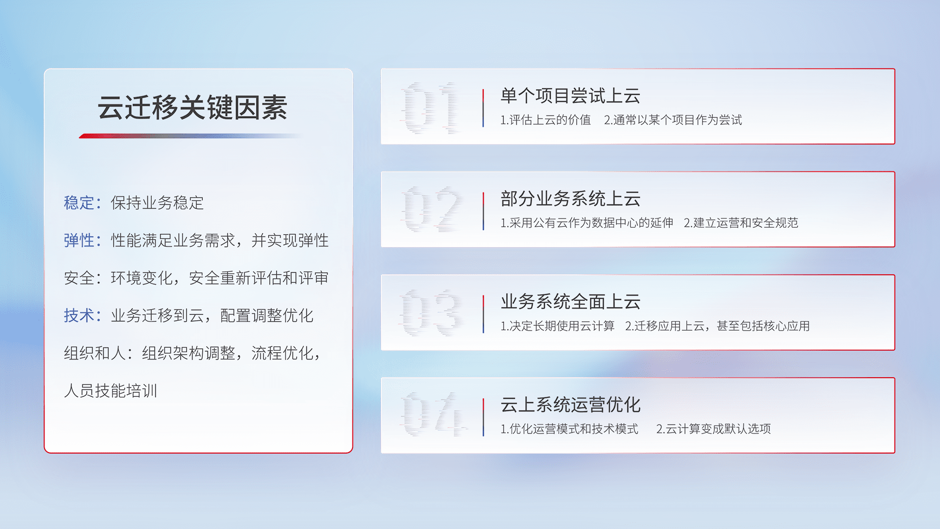 结合实际业务,,,,从规划设计、、云平台选型、、、云原生改造、、数据迁移、、、、集成交付,,,迁移全过程为客户识别最佳上云路径,,,做好风险识别管理,,,设计网络架构、、身份权限、、、、安全审计合规、、、、操作审计、、日志审计、、、、监控告警策略、、、多站点容灾设计等,,,,对云上基础设施进行整体规划,,,提升IT治理水平,,以满足弹性、、、、高可用、、高性能的需求。。。。