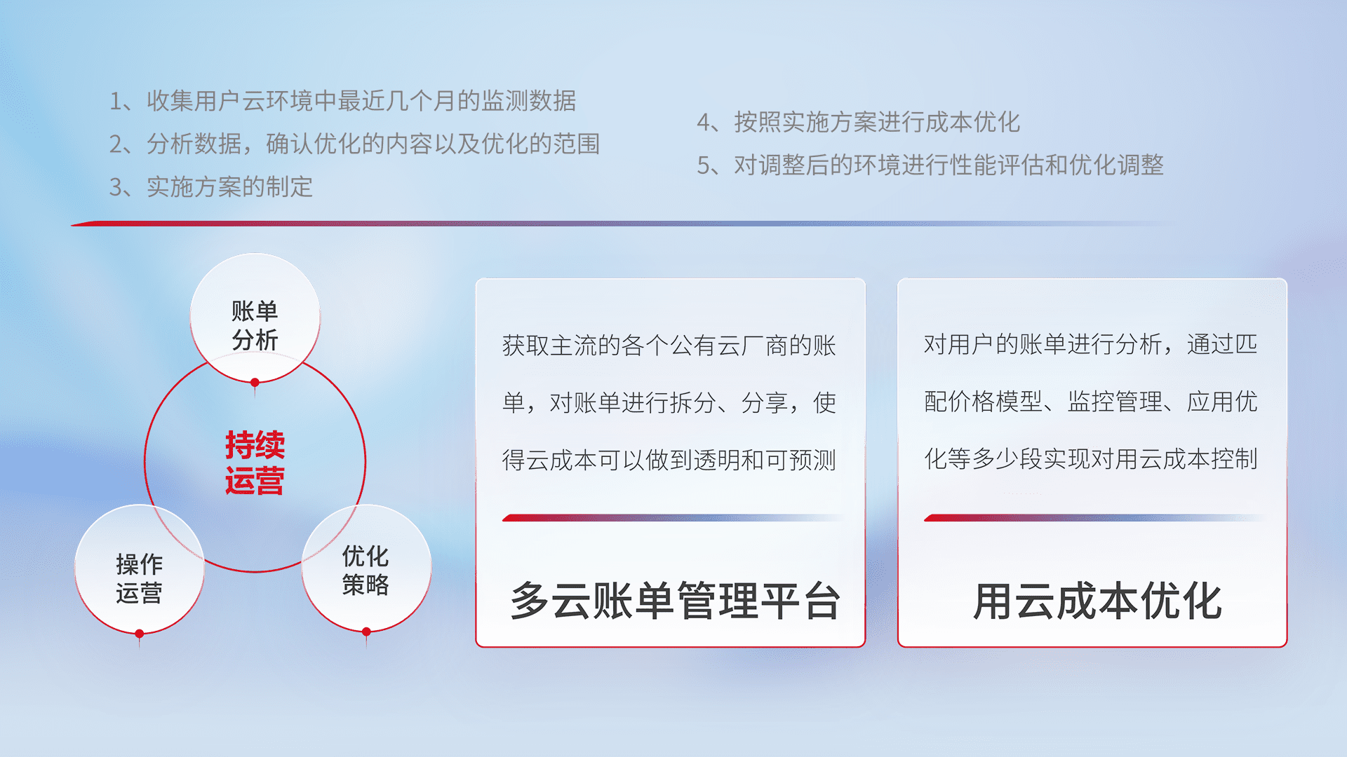 通过多云纳管,,,以统一的资源数据模型把客户的云资源进行抽象和封装,,,进而实现对多云资源的统一操作,,,,保障云资源管理的可靠性、、、稳定性与可用性。。。。量身定制化运维内容,,配置、、开发运维、、、、补丁管理、、、备份、、、监控、、认证和访问管理、、、审计和日常巡检等,,,保障在用云过程中的可靠度,,,,稳定度以及高可用率。。